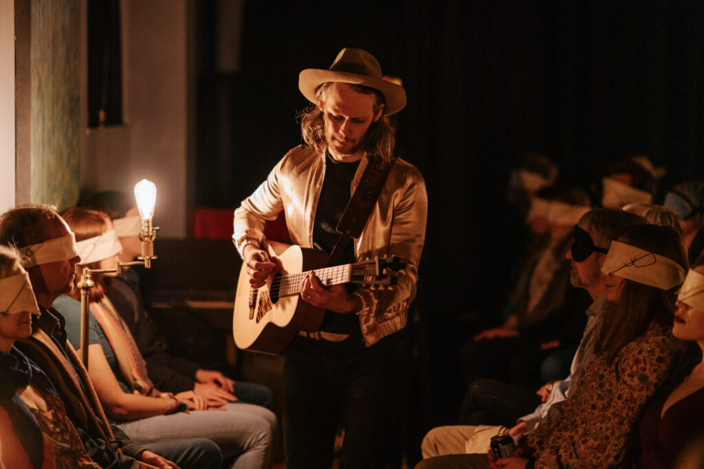 Golden Hour is a 60-minute, immersive live music experience created in Charlottesville, Virginia by musicians Suz Slezak and David Wax (of David Wax Museum) and Lauren and Daniel Goans (of Lowland Hum). For the entirety of the performance, guests are seated and blindfolded while the four principle musicians move about the space, holding the listening close in an ever-changing sonic landscape. What initially seems like a unique way to engage with live music soon becomes an opportunity for presence, stillness and participation in a deep listening experience that is simultaneously individual and communal. These artists have been honing this experience since 2017, and in 2020 NPR showcased the experience in a feature: “These Charlottesville Musicians Want To Change The Way You Experience Live Music.”