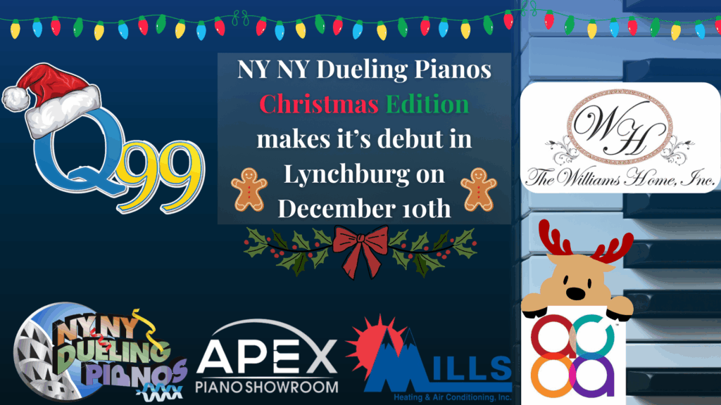 Q99 and The Williams Home Lynchburg present New York, New York Dueling Pianos Christmas Edition! Two pianos, two musicians and an unforgettable night of live music and comedy. Bring your requests, these guys play just about anything including some of your Christmas favorites with a Dueling Pianos twist. This is an all ages show, so bring the whole family.