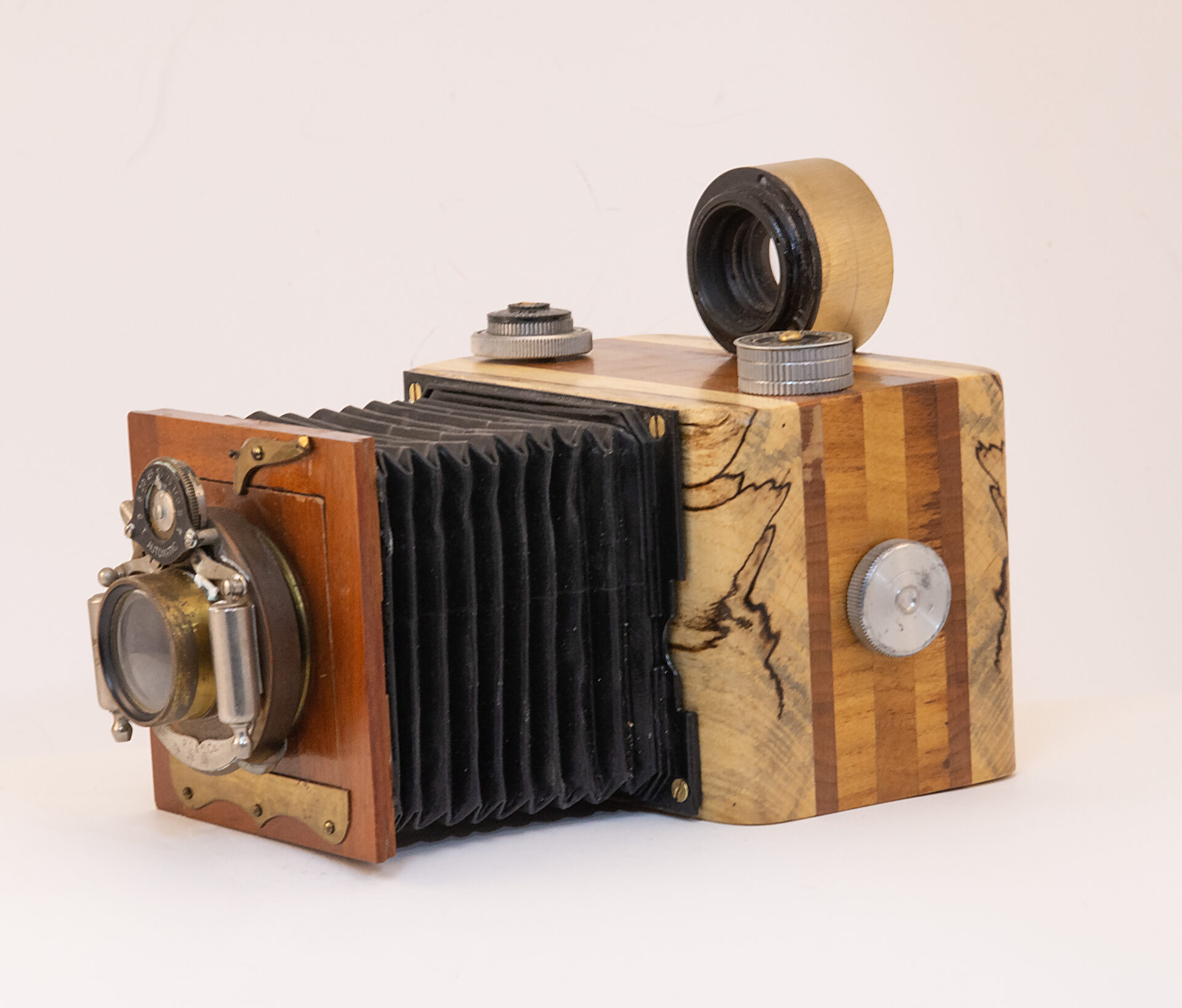 Second Place, “Belloise” by John Shuptrine, caught the juror’s eye through its clever use of antique camera parts and wood to build a sculpture that balanced nostalgia, humor, and technical precision.