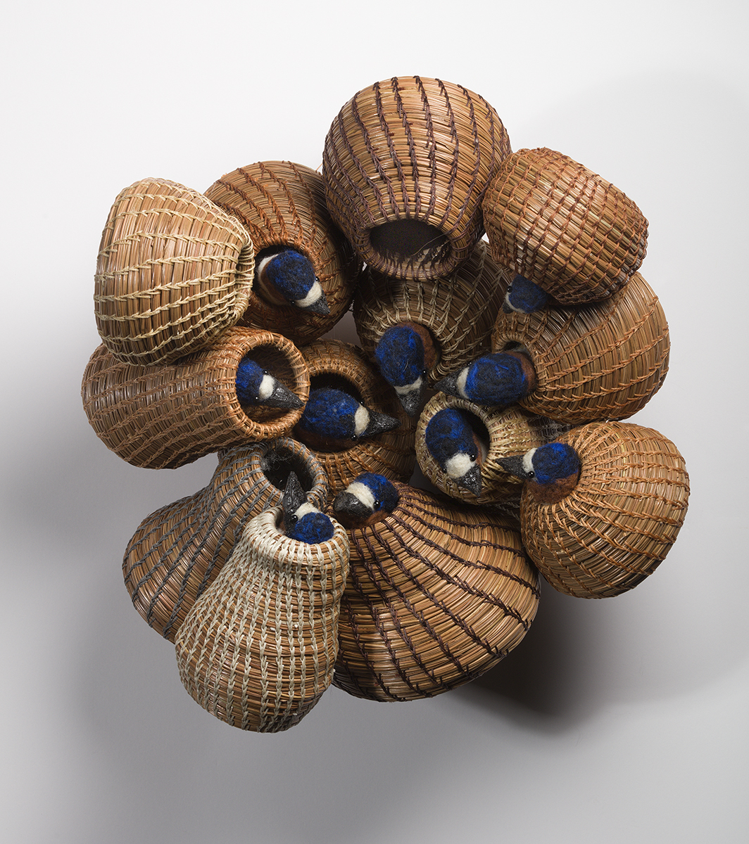 Elizabeth Weber’s “Nesting”, our First Place recipient, was chosen for its stunning transformation of natural materials—pine needles, wool, and wood—into an intricately constructed visual narrative. The juror was especially impressed by its geometric composition and how it celebrated nature through craftsmanship.