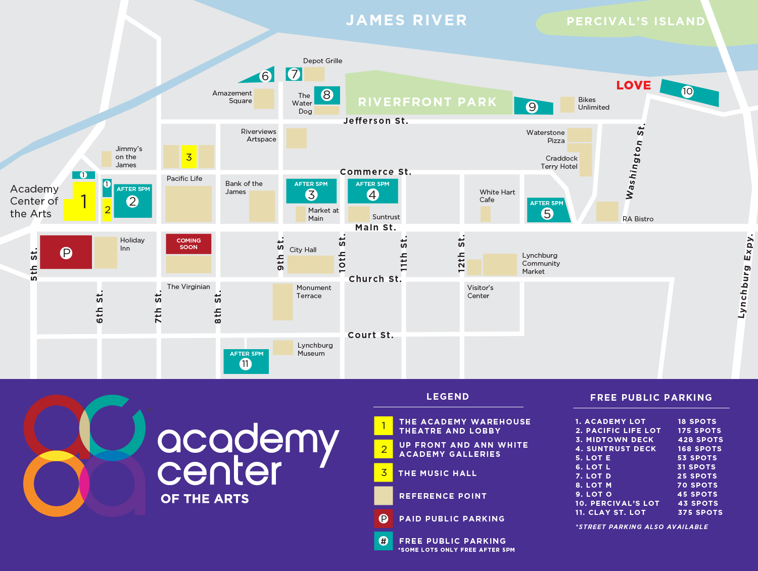 Parking is available on-site and throughout downtown Lynchburg. Free public and paid parking lots are within walking distance. In addition, street parking is also available on most streets. Visit the Downtown Lynchburg site for more Downtown parking information.