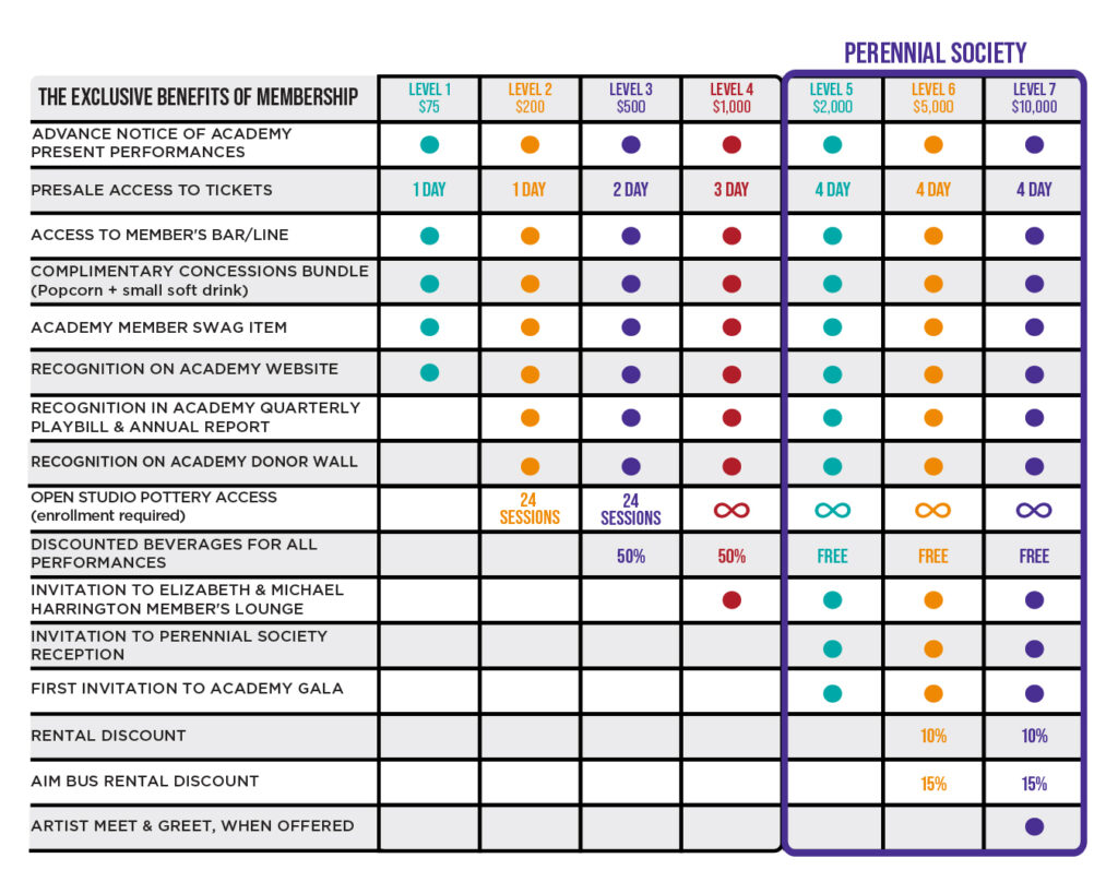 Your support means the world to us. Your gift, at any level, directly impacts our community through the arts. Art is essential, and Academy donors give in a variety of ways — annually, throughout their lives, and in their estate plans. Donors are recognized in our Annual Report. Level 2 – 7 Members receive a printed copy of our Annual Report and Level 3 – 7 Members are featured on our donor wall located in the Historic Theater.